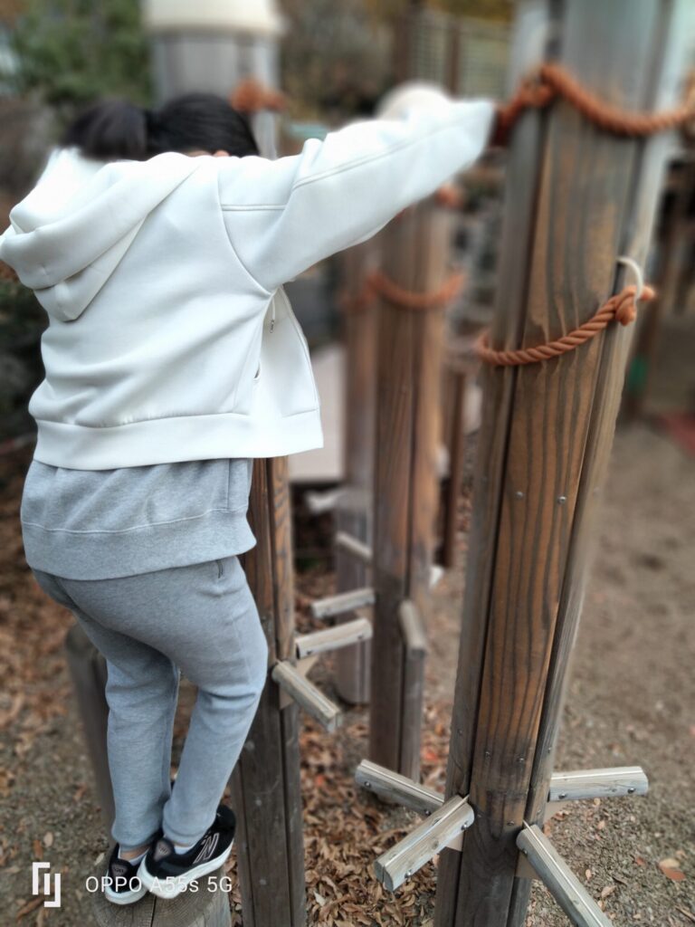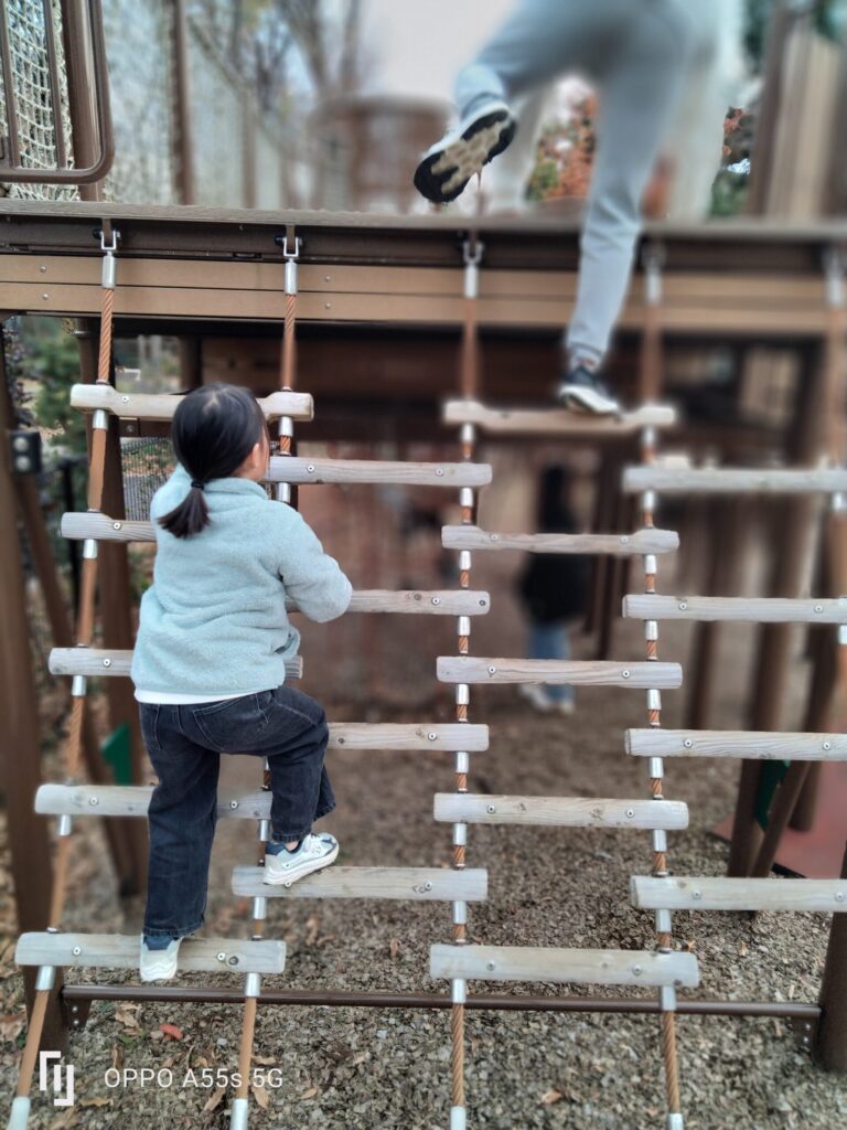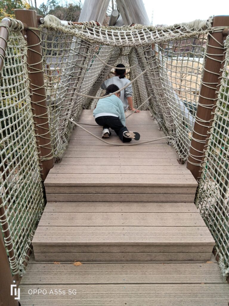 つぎにターザンロープ(正式名称は不明です)のぶら下がりをやりましたが、勢いがよく左右に振られるためしっかりロープを持っていないと危なそうなアスレチックでした。実際地上へ振り落とされている子供さんもおりました。