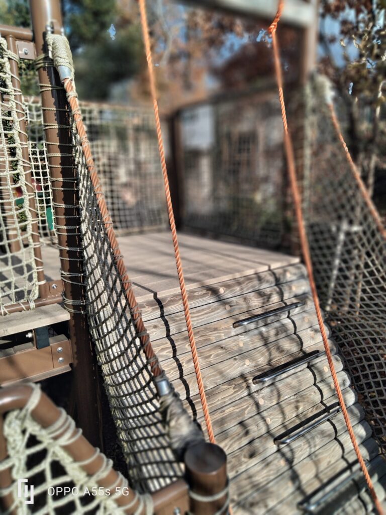 入り口で入園料を払い園内を進行していくと冒険の森フィールドアスレチックというものがありました。入園料とは別料金(一般300円、小学生100円)がかかりましたが面白そうなアスレチックが満載でこれはやってみるしかないと思い、即受付をさせていただきました。小学校高学年の長女も低学年も楽しんで遊ぶことができました。我が家の場合は約15分~20分くらいでまわれる規模でした。
