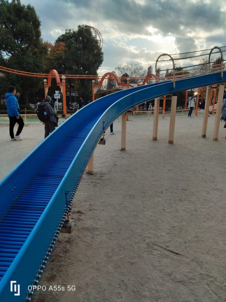 ほかに滑り台が2台ありましたが1台は注意書きにあるようにスピードがかなり出るようで、特にパパさんが子供を抱え滑ると体重が重く予想以上にスピードが出てしまい滑りおえると同時に転倒している姿を何度か拝見しました。体重の思い大人の方ほど要注意です。長女も滑りましたがめちゃくちゃ滑ると言っていました。もう1台の滑り台はローラーのついた滑り台でした。