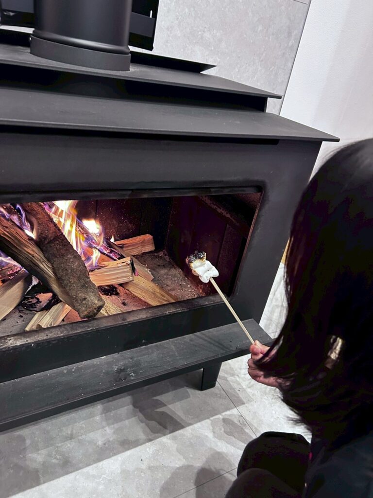 部屋には暖炉があり、マシュマロを焼いて我が家は夕食前でしたが楽しんでいました。溶けてとても美味しかったです。ベッドは全部で6つ用意されていました。パジャマはなく、シャンプーとコンディショナー、ボディソープはDHC製で良い感じでした。冷蔵庫内部は何も入っていませんでした。テレビは様々なサブスクが入ってました。