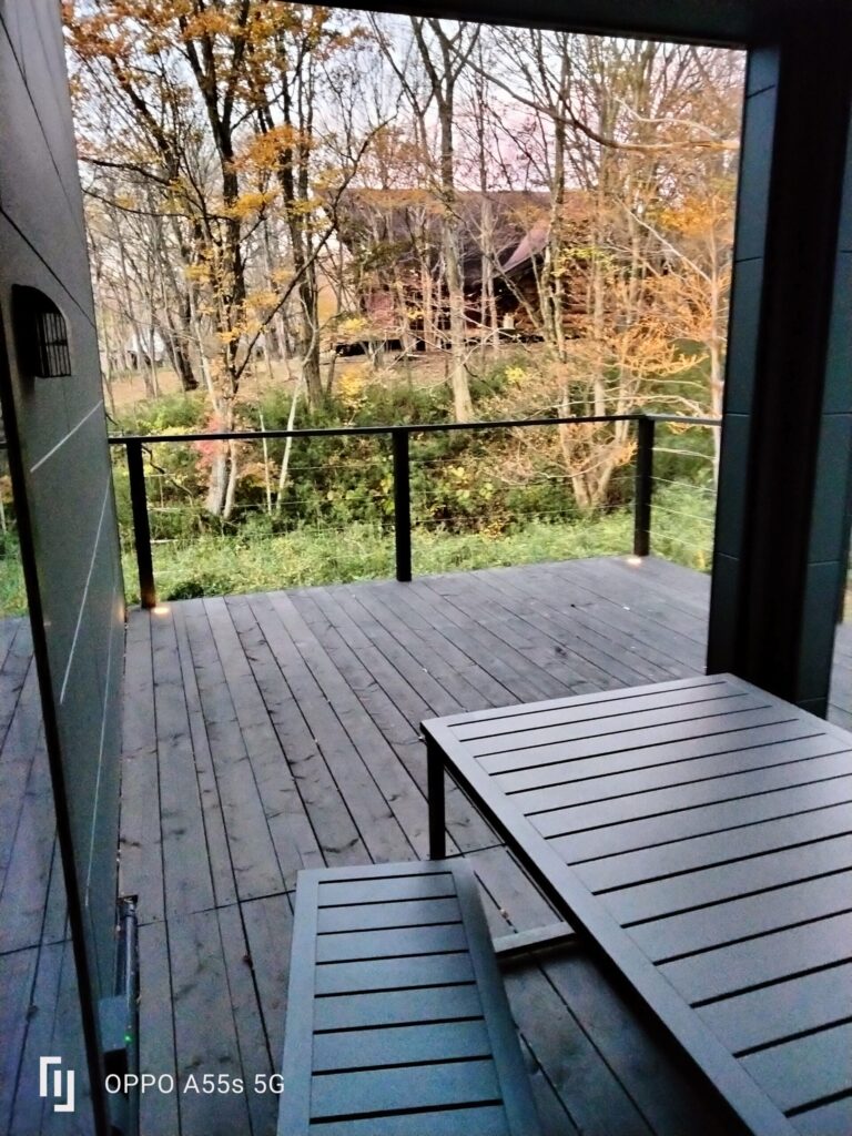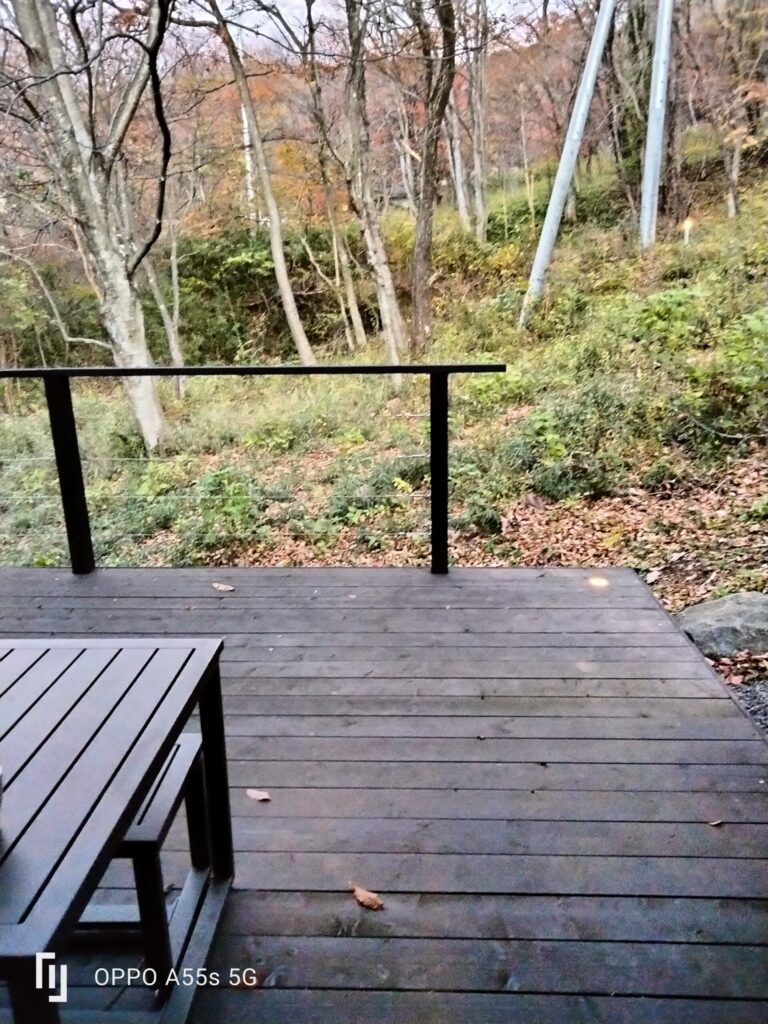 翌日普段どおり6時前に起床しコテージにベランダがついていたので、外に出ると寒さの中ですが静けさと何か動物の鳴き声が響き渡り、自然を満喫しておりました。コーヒーも淹れて最高でした。数ヶ月住んでもいいかなっと思わせていただきました。