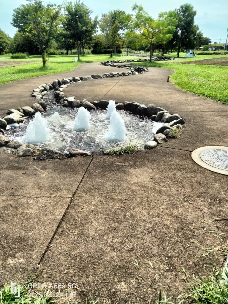 左上の噴水では夏場お子さんたちが中に入り楽しそうに遊んでいます。また夏場に敷地内のスプリンクラーから、水が出ることがありその際はただただ子供たちは水に濡れることを喜んでいるようでした。